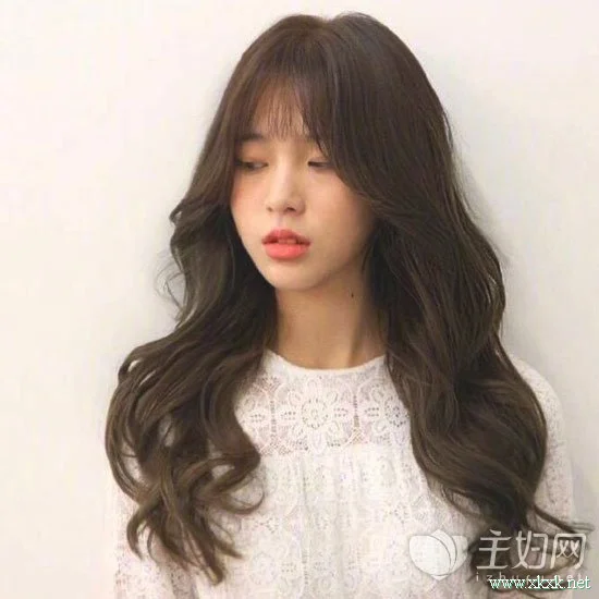 轻薄的齐刘海与长卷发搭配真心好看。对于轻熟女们而言,这款长发卷发造型最适合尝试了,整体头发烫出波浪卷弧度,配上薄刘海,同时将两边的头发外翻卷设计,与染发颜色浅亚麻色搭配,显白好看很显洋娃娃气质。