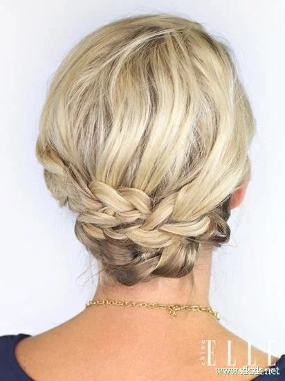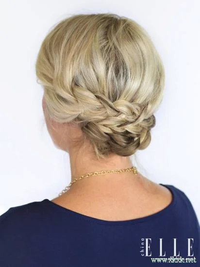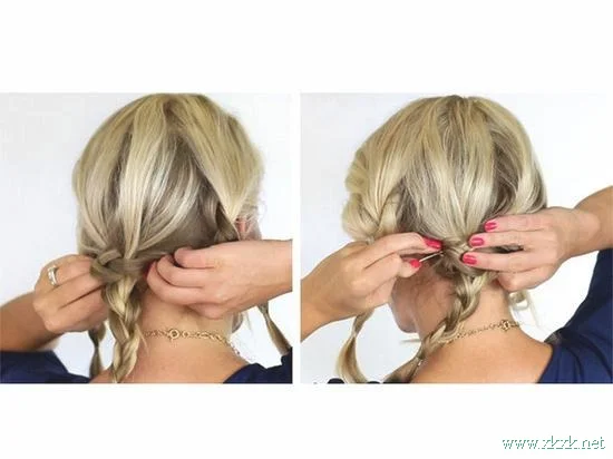 STEP2:将左起第三个小辫在第二个小辫上绕圈,将发梢隐藏在辫子底部,用U形夹固定。