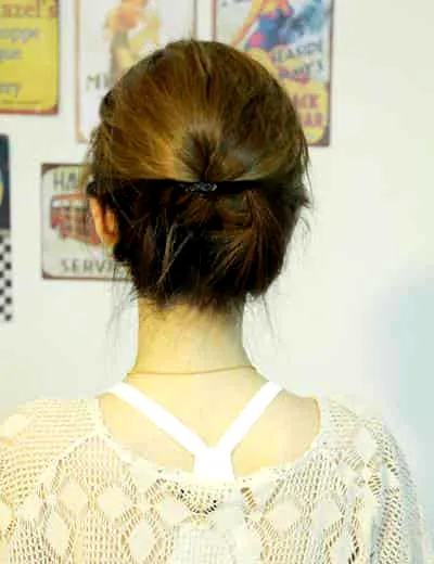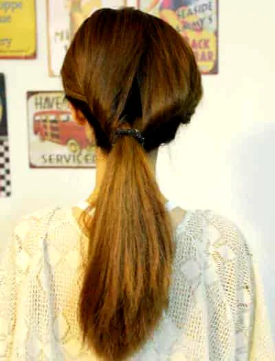 步骤二:然后将马尾往下塞,像图中示范的那样将马尾全部塞进去。