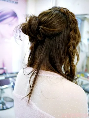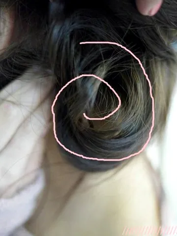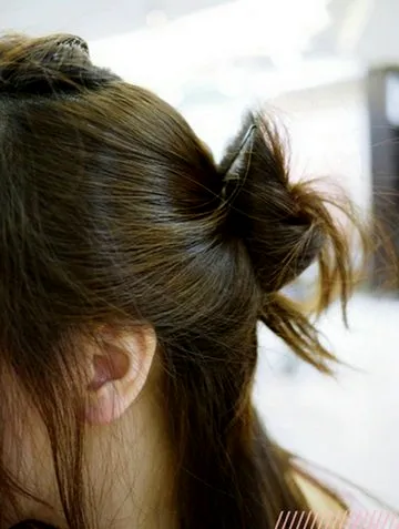 第五步:绑法很简单,就拉一大撮头发之后,照着图示往内卷,完全不需要什么技术,立刻就变成一个小包包啰。