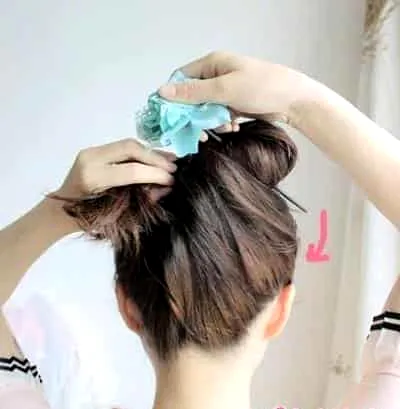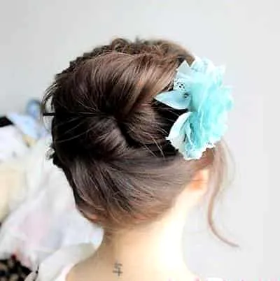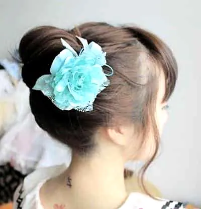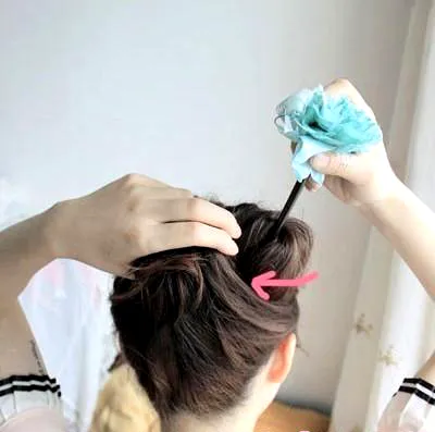 步骤二:拿出事先准备好的花朵发簪,如图所示把马尾辫放在发簪上面,然后把头发覆盖到发簪上。