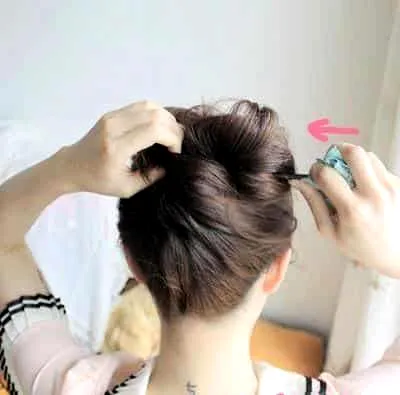步骤八:取出发簪之后,把发簪横过来,往里插住头发,注意这个时候左手拿的头发要往下掰,这样才能让发簪叉住头发,整个把发包套住。