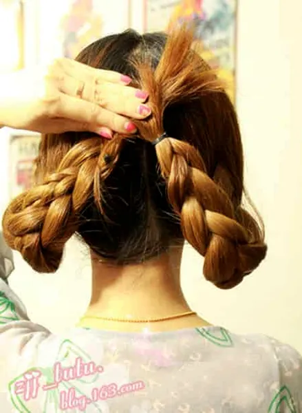 4、另一边也是一样的编发,编好之后下一步根据这两个发辫为基础,编一个大发辫。