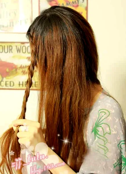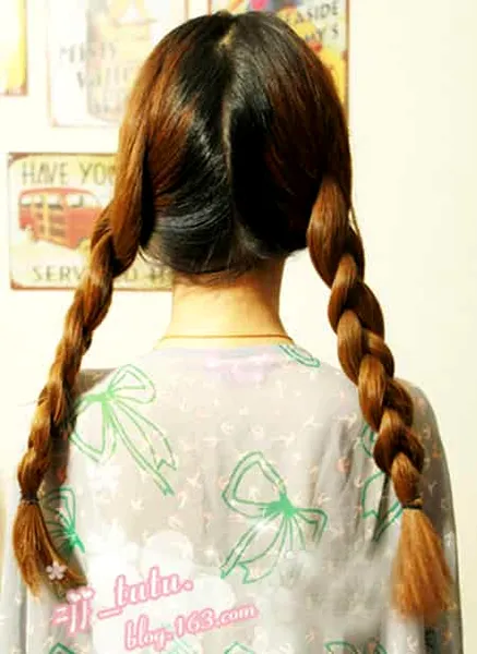 6、编好之后用小橡皮筋绑好,另一边也是一样!两个大大的麻花辫。
