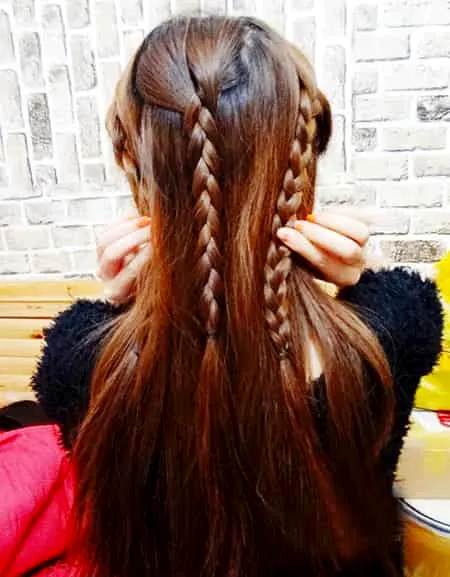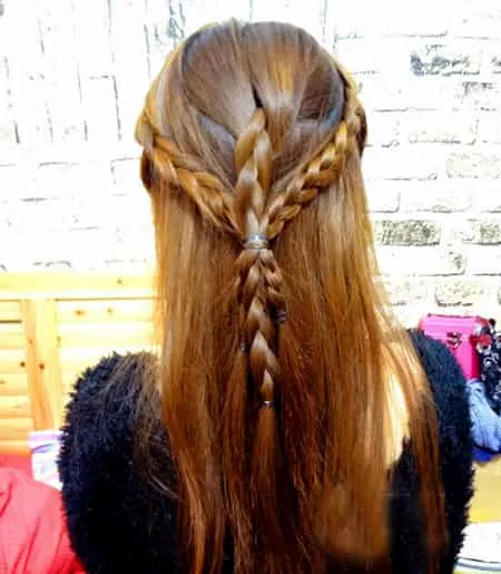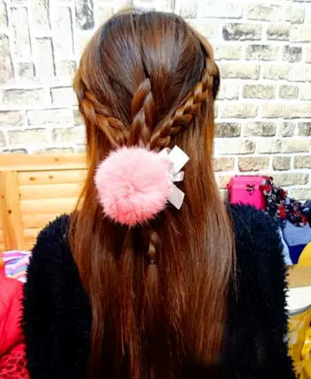 step5:接着下一款发型,很简单哦,就是跟着这一步之后,把中间的小皮筋取下,将辫子和所有头发汇在一起绑起来。