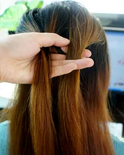 第五步:将扎好的头发一起向内卷入,如下图。编股处在微微的用手拨松。