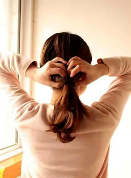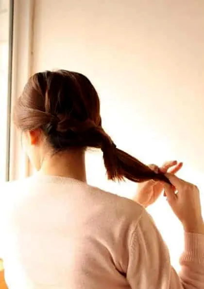 5、再将马尾从皮筋里面穿过去。注意别把头发搞散了。
