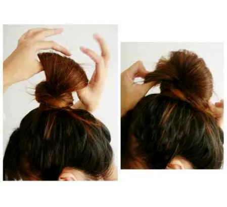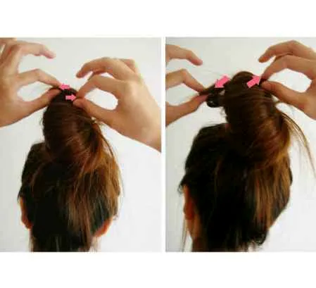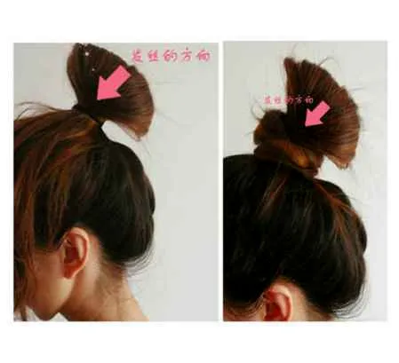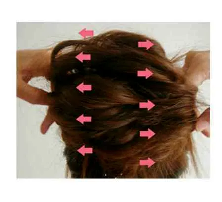 第四步:整理。盘完发后,要用手指伸进发圈,上下整理 头发的均匀程度,这样出来的效果才会上下均匀,比较好看。