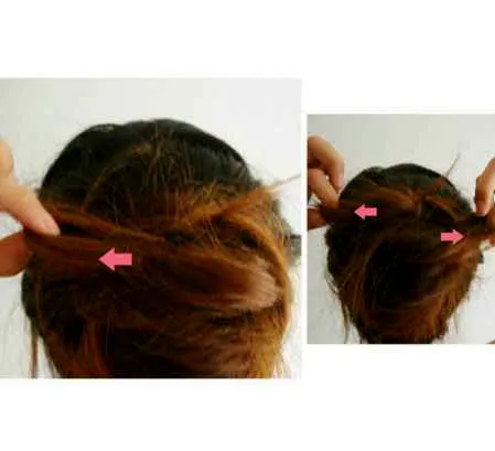第三步:将发尾留在另一侧。然后将多余的发尾缠绕到发根处并固定。