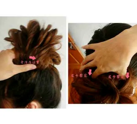 第八步:拽发固定。将所有拽出的发圈全部套在左右手的食指上,然后分别向左右扯拽,效果基本上就能看出了!一般用四个就可以固定住了,左右各两个,分别向上**和向下**。注意:黑发卡固定的是拽出来的发圈,与贴在头皮上的头发夹在一起来固定就可以了!