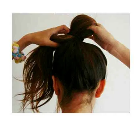 第二步:用橡皮筋扎发时,最后一圈不要将头发全部抽出来。