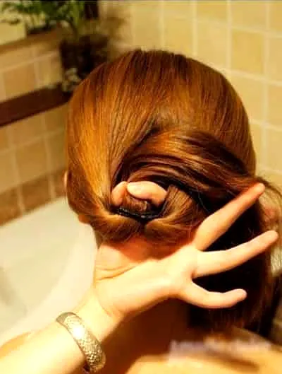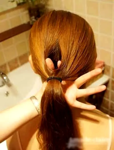 第二步:受从缝隙下方将往里马尾绕过缝隙来。