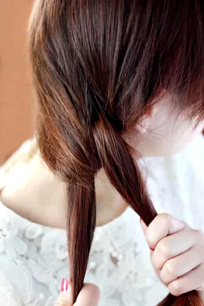 2、再将这两束头发打个单结,就像平时的绳子打结一样!