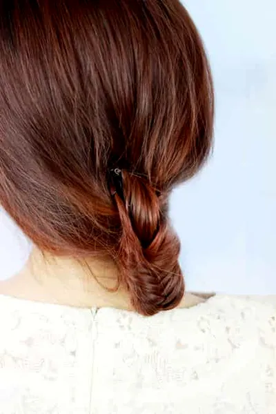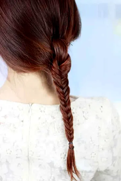 4、打完结之后将下面剩余的头发编成鱼骨辫。不知道的MM编成细细的麻花辫也OK哦!