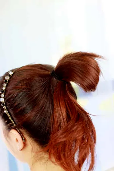 7、接着我们来第二款咯。如图所示,将头发扎成马尾,头发不要全收,留住一部分,成一个小球状。