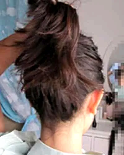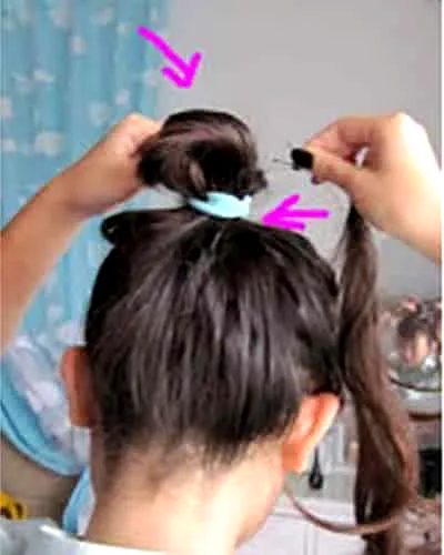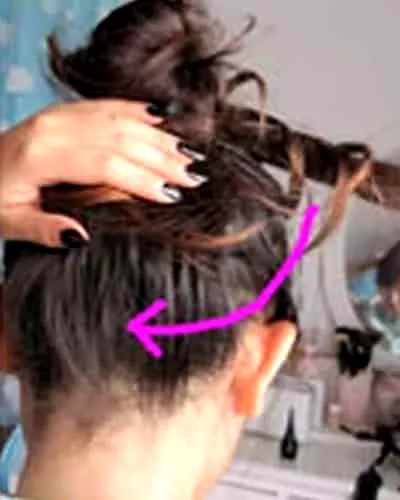 第二步:马尾的最后一圈不要将发束拉出来,然后按照箭头方向接上一股发束。