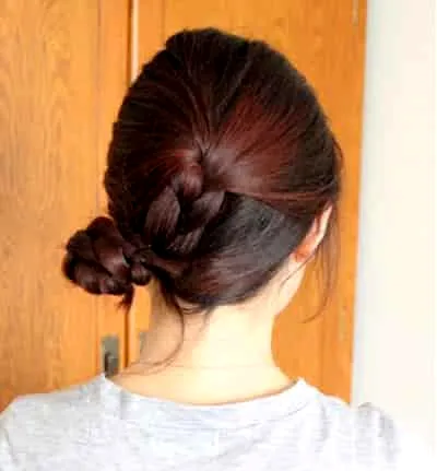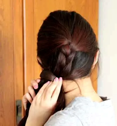 第五步:将上半部分的麻花辫绕下半部分的麻花辫转一圈,然后用夹子固定好。