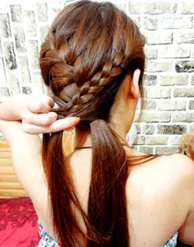 将发饰取下,**盘起的马尾,左侧的辫子保持原样,将右侧的头发也用三股辫的形式向后编,麻花辫编到发尾。