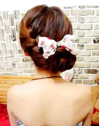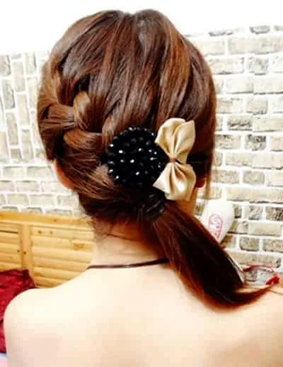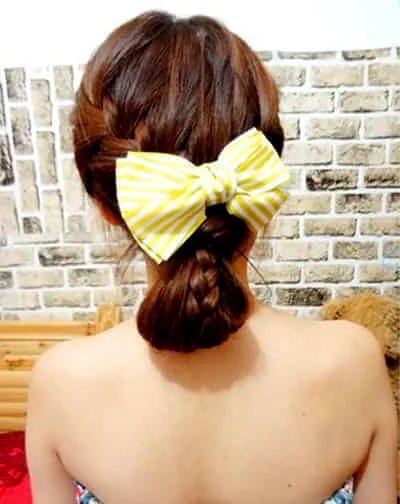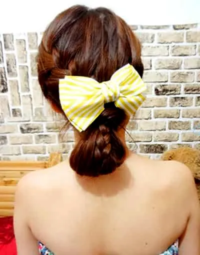 将右侧的麻花辫和左侧麻花辫马尾绑在一起,然后挽成一个低发髻。发尾缠绕在马尾的节点处。别上好看的蝴蝶结发饰,甜美编发就完成了。是不是很有韩剧女主角的感觉。