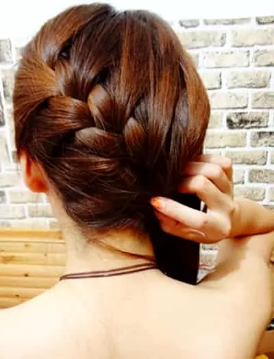 从左侧额前取一小束头发,向后进行编发,在编发的过程中不断从两侧续发编制。编到如图所示的位置,就可以用一个小发圈绑住。