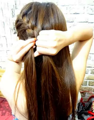 将发夹取下,我们继续编发。将右侧的头发也续发到左侧的麻花辫中,右侧的头发全部加入到麻花辫中,就可以用橡皮筋绑住了。