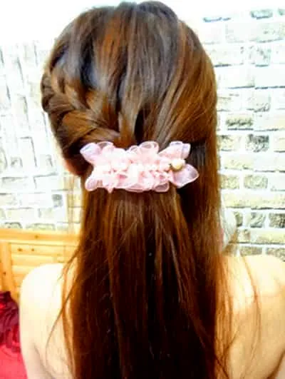 接下来将右侧额前的头发和上一步绑好的麻花辫用一个漂亮的发夹固定在一起。如图所示。喜欢的MM到这一步就可以停止编发了,非常温婉柔美的发型。