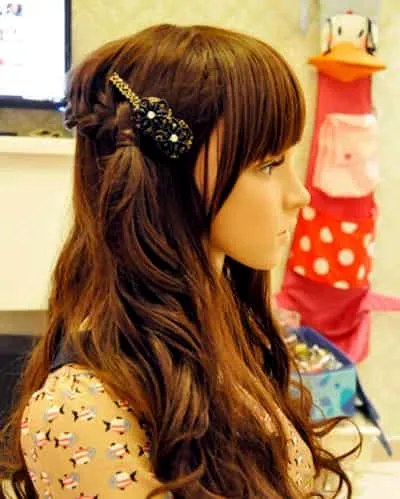 步骤六:上半部分的编发基本完成。用一个好看的发夹将碎发夹起来,是不是很漂亮呢?