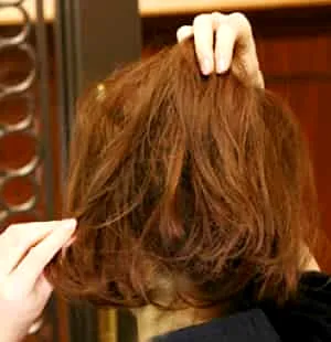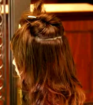 扎发步骤三:接下来将开始夹起备用的头发放下来,刚好可以遮住下面的头发,用手稍微调整一下,使看起来更加自然。