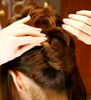 扎法步骤二:将脑后剩下的头发,用橡皮筋简单的绑起,然后抓住发尾往上扭转,然后用黑色的U型发夹固定。