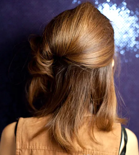 然后将头发分为上下二层,把上层头发向左边拧转,很简单的手法,这样的步骤其实是针对发量较少或者后脑扁平的**们的。