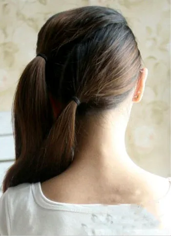步骤1:先将头发梳成上下两股发型,斜分的方式,然后用皮筋分辨在作则扎出两个马尾。