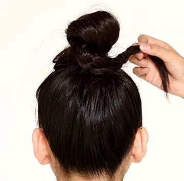 Step4:记者将马尾剩余头发从外向内梳成花苞形状。