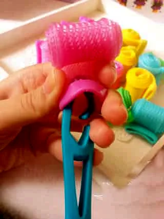 步骤九:然后将准备好的卷发工具的勾棒勾住头发。