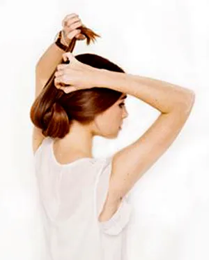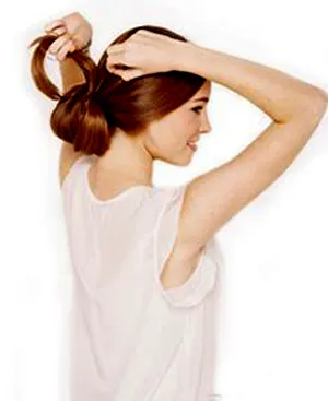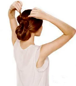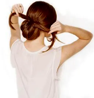 优雅盘发步骤六:将发束分成两小股,围绕在盘起的发髻上。