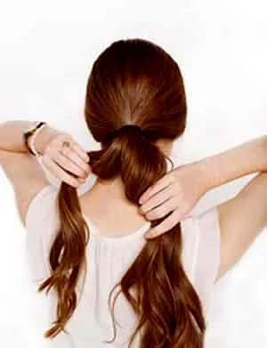 优雅盘发步骤一:将长发梳直理顺,然后用橡皮筋绑成一个低低的马尾。