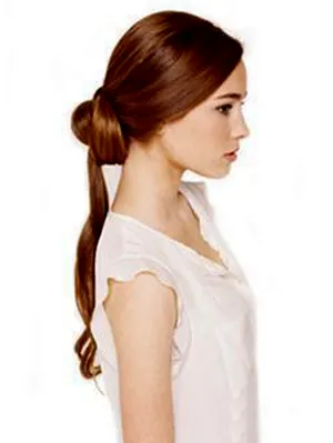优雅盘发步骤三:将右侧发量较多的那束长发缠绕在马尾的发结上。