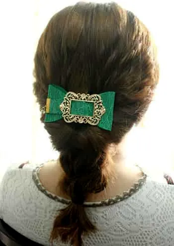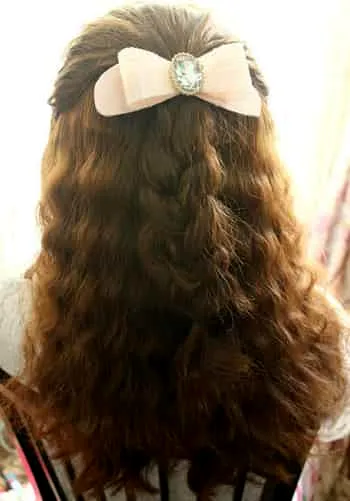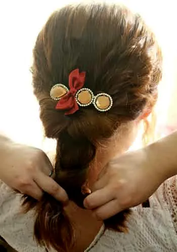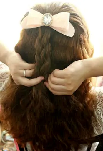 Step3:辫子扎好后,就可以稍微拉松来达到自然的效果。最后只需要在马尾的地方别一个**的发夹即可。