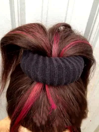 步骤二:然后在马尾的外层套入盘发神器“甜甜圈”。