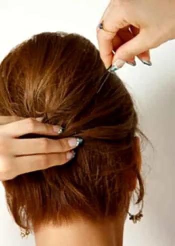 短发扎发步骤三:将后脑勺蓬松的头发聚集在一起,然后用黑色的小竖夹固定住发尾,可以喷一些发胶定型。