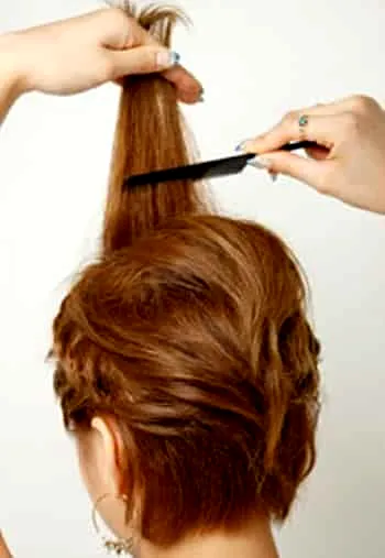 短发扎发步骤二:为了使整体造型更加饱满立体,将后脑勺位置的短发用梳子倒梳打毛,制造出蓬松饱满的效果。