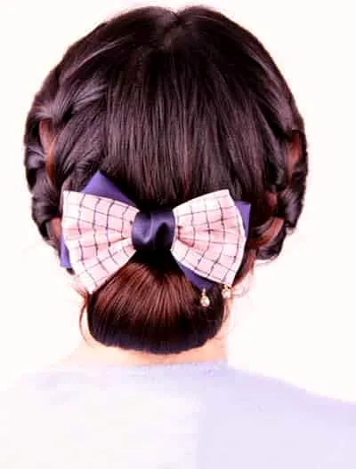 第一款盘发效果图:两侧精致的麻花辫和低低的发髻融合在一起,充满了女性的温婉柔美,别上好看的蝴蝶结发饰,更是清新甜美。
