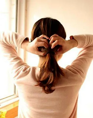 步骤五:用手从发根处挖出一个空隙,将马尾塞进去。