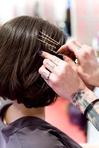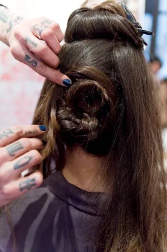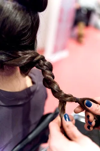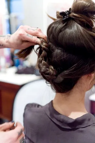 第五步:从最先收集在头顶的头发里取一部分下来,内绕成BB头的初始效果,用发夹固定好,并将编的头发完全遮掩住。