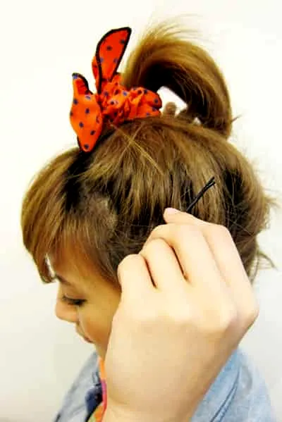 步骤六 :将更短的、剩下没有扎上去的短发继续卷成一小股,用黑夹子往上固定住。