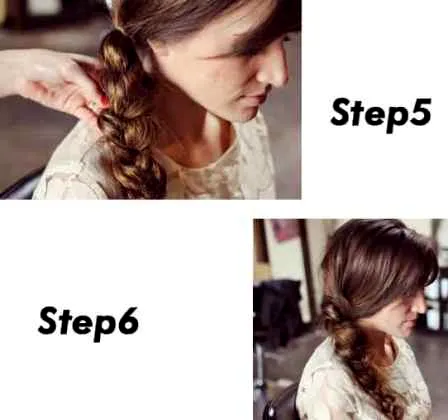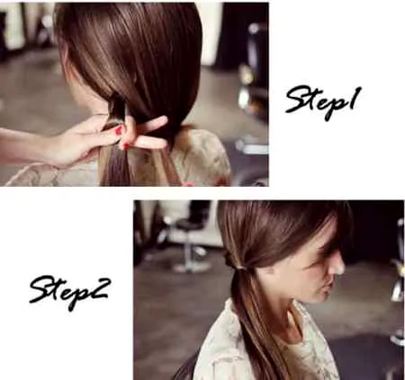 步骤2:将两股发丝旋转凝结成马尾辫,斜着低梳在耳下的部位,可让马尾更加紧固,然后用橡皮筋固定住。