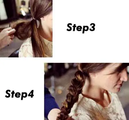 步骤4:接着将马尾的发丝松散的编成3股马尾辫,最后用橡皮固定住。
