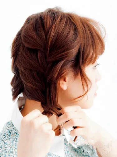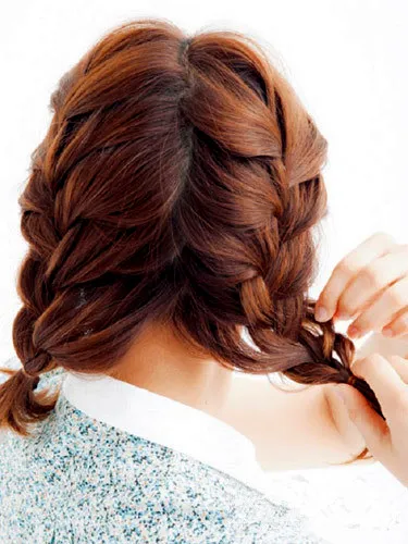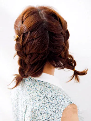 将头发分成左右两部分,从头顶开始编发并不断并入下方的头发。