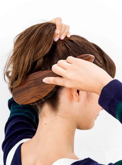 用大板梳将头发梳成高耸的马尾。
