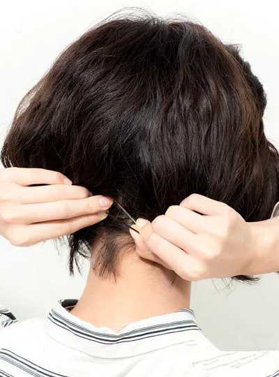 最后将脑后的头发也用发夹固定好,再将准备好的蝴蝶结发饰戴上就可以完成这款短发扎法了。