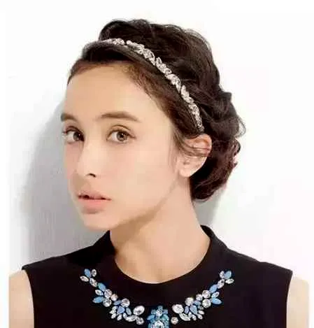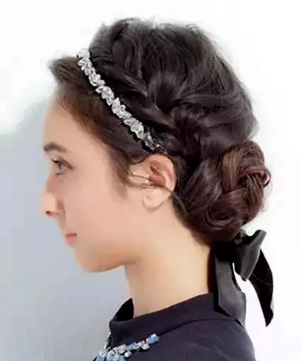 饱满的长卷发盘成纹理饱满浪漫的盘发造型,一只水晶发箍固定在前额,